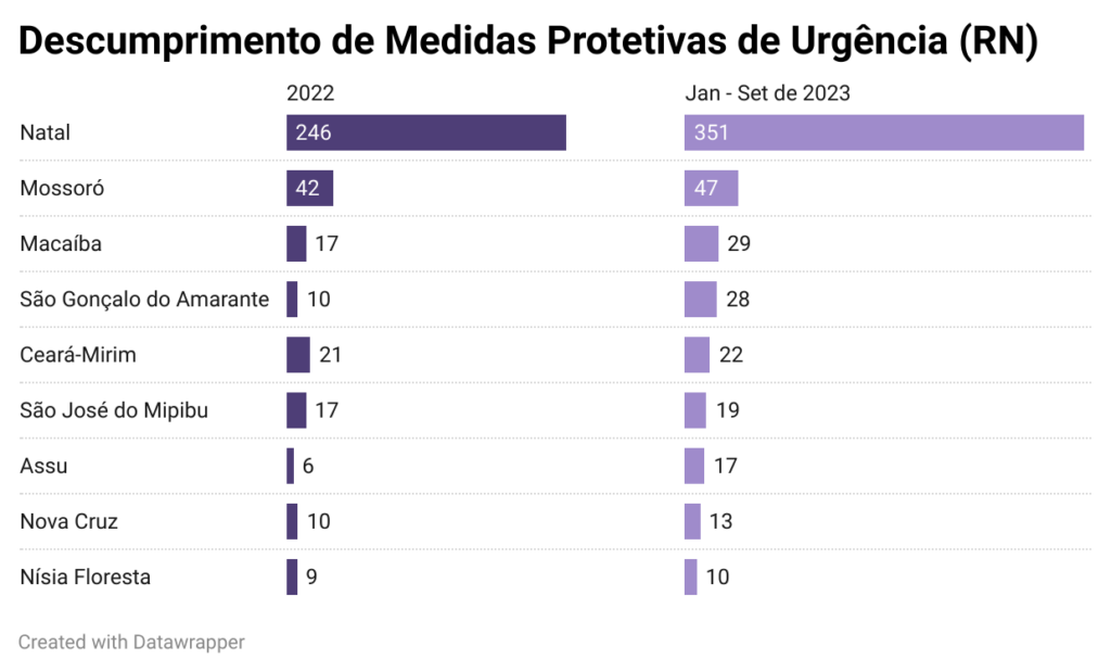 No Estado, conforme apontam os dados do MPRN, das 16 medidas protetivas concedidas diariamente às mulheres vítimas de violência doméstica, em média 10% são descumpridas. Em números reais, foram descumpridas 351 medidas protetivas na capital potiguar, de janeiro a setembro de 2023, segundo levantamento da Secretaria Estadual de Segurança Pública e Defesa Social (Sesed). A promotora de Defesa da Mulher MPRN, Érica Canuto, da 68ª Promotoria de Justiça (PmJ) de Natal, esclarece que trata-se de um percentual que precisa receber atenção, uma vez que o descumprimento pode acarretar pensamentos que buscam descredibilizar a lei e principalmente atingir a vítima.