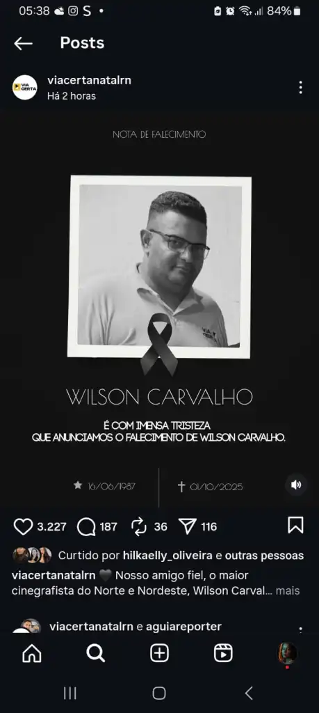 “Nosso amigo fiel, o maior cinegrafista do Norte e Nordeste, Wilson Carvalho, nos deixou na madrugada desta quarta-feira (1).