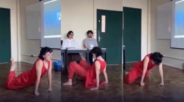 O vídeo mostra a pesquisadora emitindo sons guturais, gemidos e grunhidos enquanto dança, provocando debates acalorados sobre arte e pesquisa acadêmica.