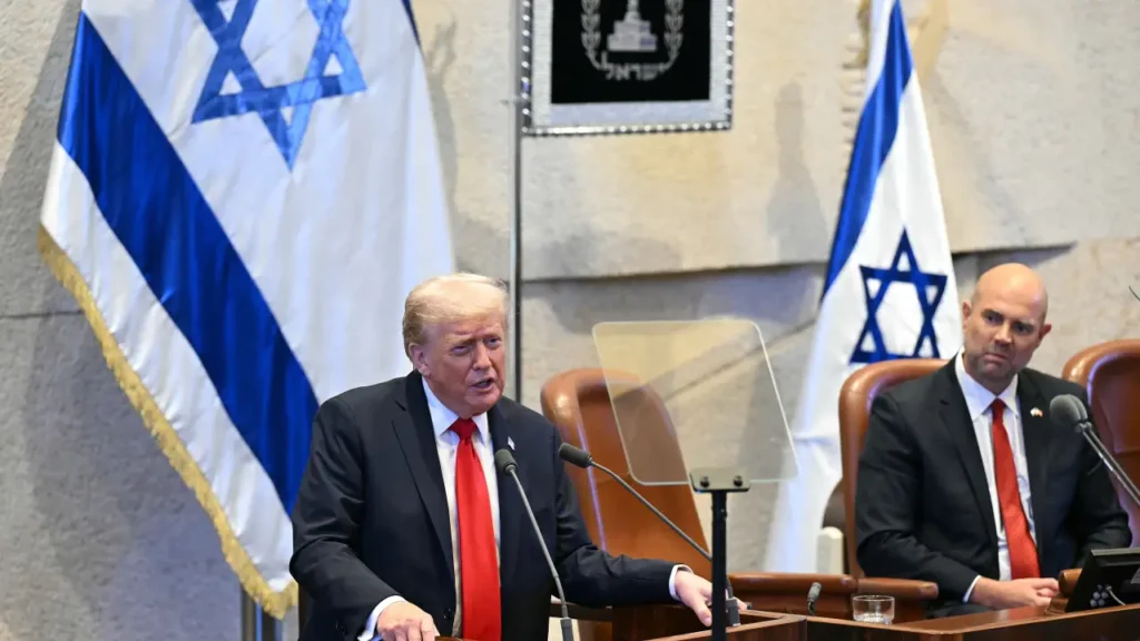 Ao entrar no Knesset, o líder republicano foi aplaudido de pé enquanto era recebido por uma sinfonia de trompetes. Na plateia, alguns usavam bonés vermelhos no mesmo estilo dos tradicionais modelos MAGA (Make America Great Again), com as palavras “TRUMP, O PRESIDENTE DA PAZ”. Antes do início do pronunciamento, a multidão gritava seu nome em uníssono: “Trump! Trump! Trump!”