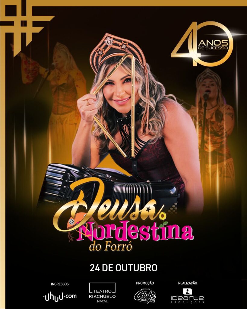 Ela carrega no nome a essência do ritmo mais característico do Nordeste. Deusa do Forró, como é conhecida a potiguar Iranilda Albuquerque, chega aos 40 anos de carreira celebrando o amor pela música nordestina e a força de suas raízes. No dia 24 de outubro de 2025, às 20h, ela sobe ao palco do Teatro Riachuelo Natal, com o seu tradicional triângulo na mão, para um espetáculo emocionante e cheio de simbolismo: “Deusa, 40 anos de Forró Raiz e Resistência”.