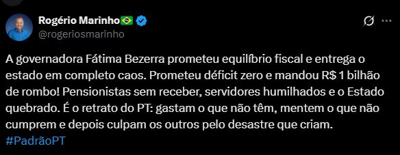 O senador Rogério Marinho usou as redes sociais para disparar contra a incompetência do governo Fátima Bezerra. O senador disse que a governadora prometeu equilíbrio fiscal e entrega o estado em completo caos.