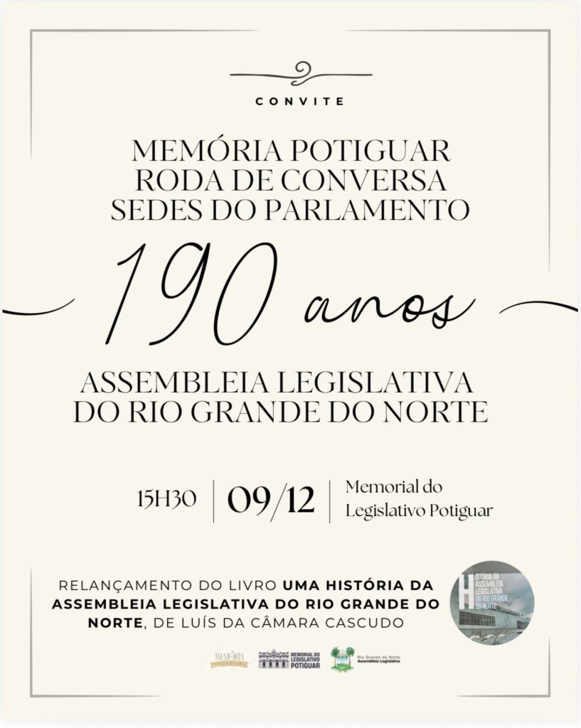 O evento será uma edição comemorativa do projeto “Memória Potiguar”, com o tema “Sedes do Parlamento”, dedicado a revisitar a história do Rio Grande do Norte a partir das sedes que acolheram a ALRN ao longo dos séculos. Trata-se de uma roda de conversa composta pelos ex-presidentes Nelson Freire, Álvaro Dias e Ezequiel Ferreira de Souza, além do ex-deputado estadual Valério Mesquita.