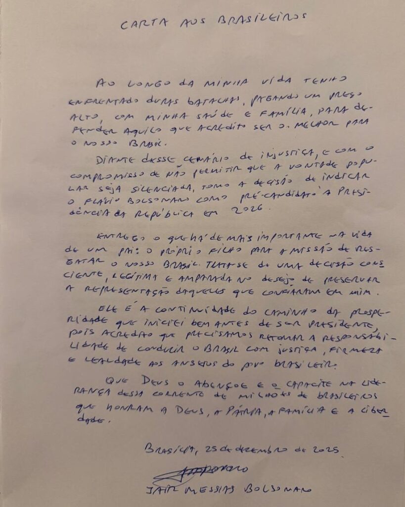 No texto, Bolsonaro afirma que decidiu indicar Flávio Bolsonaro como pré-candidato à Presidência da República em 2026. Embora a carta traga a data de 25 de dezembro, Flávio disse que recebeu o documento no dia 23, por meio de um advogado, e que ele teria sido escrito na Superintendência da Polícia Federal.