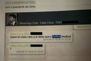 Fábio Faria pergunta a Vorcaro quem lhe repassou a informação de que Toffoli votaria contra a usina. O banqueiro cita o advogado Carlos Vieira Filho, especialista nesse tipo de causa. Ele é filho do presidente da Caixa, Carlos Antônio Vieira Fernandes. Essa conversa foi no dia 13 de setembro de 2024.