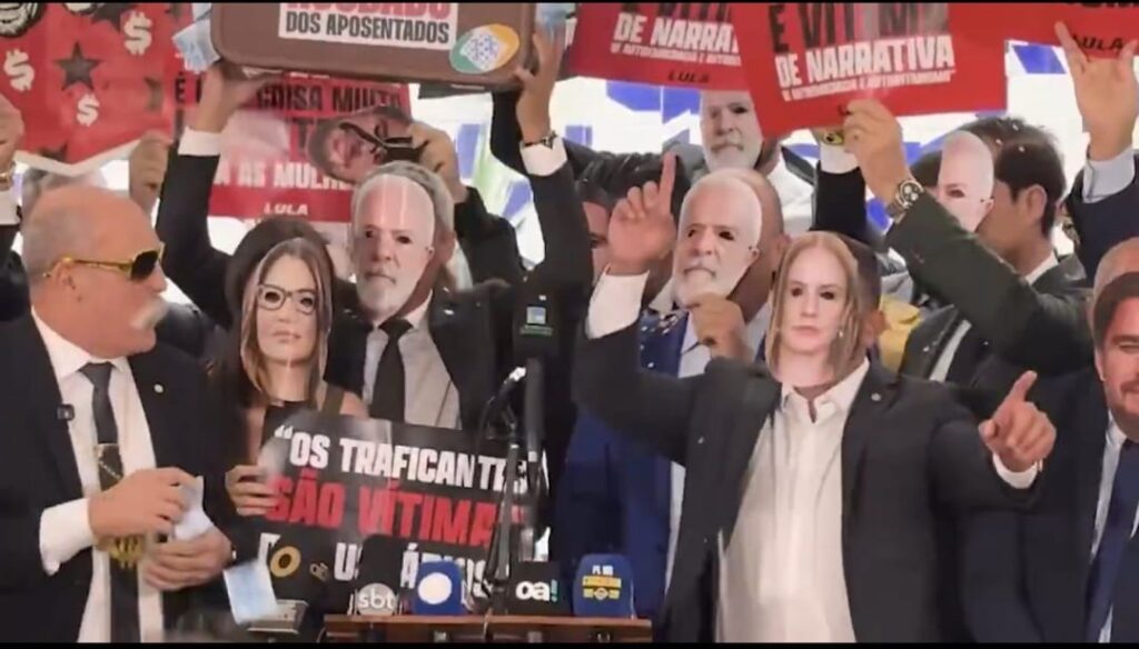 Ele encerra fazendo uma sátira com o atual governo levando placas com o nome ‘Unidos Pela Corrupção’ e usos de máscaras com as fotos de Lula, Daniel Vorcaro, Gleisi Hoffmann e Janja.