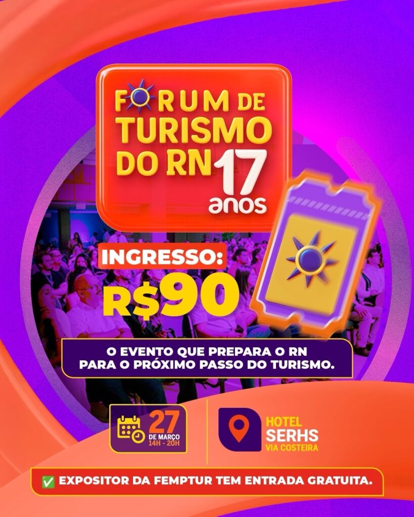 A participação no 17º Fórum de Turismo do RN é um investimento estratégico para todos os envolvidos no ecossistema turístico. O valor de entrada é de R$ 90, um custo acessível para quem busca se atualizar e fazer parte das discussões que impulsionam o setor. Expositores da FEMPTUR terão acesso gratuito ao evento mediante apresentação da pulseira de identificação.