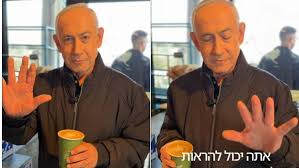 Netanyahu finaliza o vídeo agradecendo pelo café ao garçom e brinca: “obrigado pelo café, está excelente. Não sei quanto às calorias, isso me parece muito perigoso”.