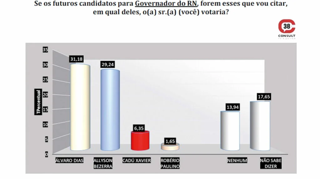 A pesquisa indica um empate técnico entre os dois primeiros colocados, dentro da margem de erro, projetando uma disputa acirrada pelo comando do Rio Grande do Norte nas eleições deste ano.