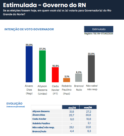 A pesquisa foi realizada de 23 a 26 de março de 2026 e ouviu 2.000 eleitores, possui margem de erro de 2,2 pontos percentuais e nível de confiança de 95%, com o seguinte regitro no TSE: RN-07240/2026.