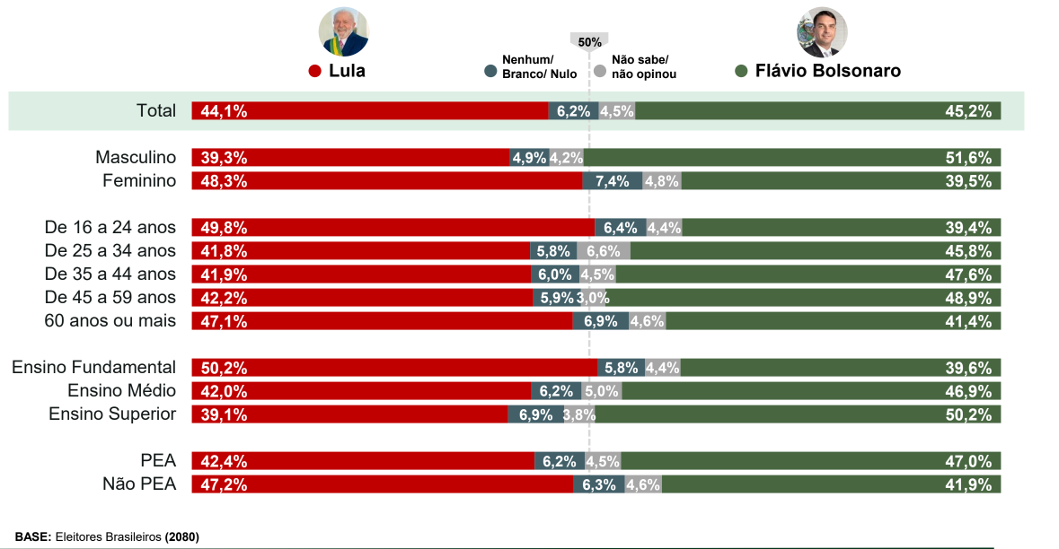 Na comparação com a pesquisa anterior, realizada em fevereiro, Flávio oscilou positivamente, passando de 44,4% para 45,2%. Já Lula também cresceu, indo de 43,8% para 44,1%.