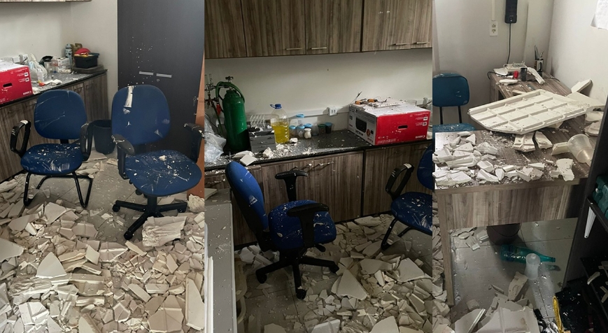 “A calha não deu vencimento de segurar a quantidade de água. Aqui no espaço tem muitas árvores, o que deve ter entupido a calha. A água transbordou para a laje e molhou o gesso, e o gesso caiu. Foi tudo de madrugada”, afirmou.
