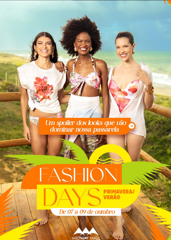 A temporada de desfiles está de volta ao Midway Mall. Entre os dias 07 e 09 de outubro, o shopping promove mais uma edição do Fashion Days, evento consagrado no calendário de moda potiguar, que apresentará ao público as principais tendências da temporada primavera/verão.  Os desfiles acontecem diariamente a partir das 17h, na Praça Central